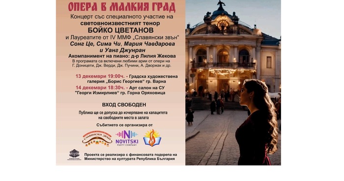 Сдружение "Славянски Звън" и "Новицки парти къмпани" канят ценители на два концерта под наслов “Опера в малкия град”, които ще се проведат в градовете Варна и Горна Оряховица.