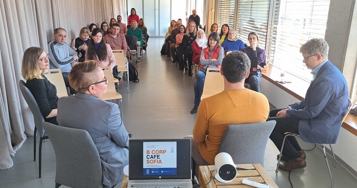 Второто издание на B Corp Café представи новите членове на B Corp™ общността в България: AMPECO, един от глобалните лидери в софтуера за управление на зарядна инфраструктура за електромобили, и Humans in the Loop, социално предприятие, което свързва засегнатите от конфликт общности и подпомага интеграцията и подготовката им за работния пазар. По време на събитието двете наскоро сертифицирани B Corp™ компании споделиха своя ангажимент за социално въздействие и подчертаха отдадеността си на устойчивите бизнес практики. Те изразиха готовността си да продължат своя път като B Corp™ и така да бъдат част от трансформиращата сила на бизнеса, която води света към устойчиво бъдеще. Присъстващите имаха възможността да станат част от интересните дискусии за пресечната точка на ориентираните към човека технологии и устойчивите бизнес практики.
