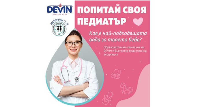 В месеца, в който празнуваме децата и щастието, с което ни даряват, DEVIN Изворна и Българската педиатрична асоциация (БПА) започват съвместна информационна кампания под надслов „Попитай своя педиатър“. Целта ѝ е да увеличи познанията и увереността на родителите при избора на най-подходящата вода за техните бебета и деца, като предоставя достоверна, достъпна и изчерпателна експертна информация, както и да насърчи педиатрите в България да дават по-обстойна консултация за типовете вода и за това коя е най-подходяща за най-малките. По повод инициативата „Попитай своя педиатър“ разговаряме с Наталия Кирилова, координатор „Комуникации и кампании“ към БПА.