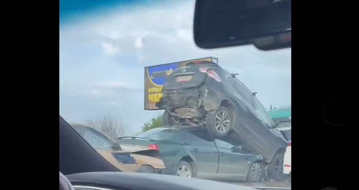Четири коли са се блъснали, като едната от тях буквално е качена върху друга.