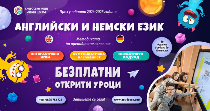 Учебен център „Скоростно Учене“ Ви кани НА ОТКРИТ УРОК по Английски или Немски език за деца от 5 години до 12-ти клас. Ще се запознаете с методиката им на преподаване и ще разгледате приятната обстановка, в която децата учат през учебната година.