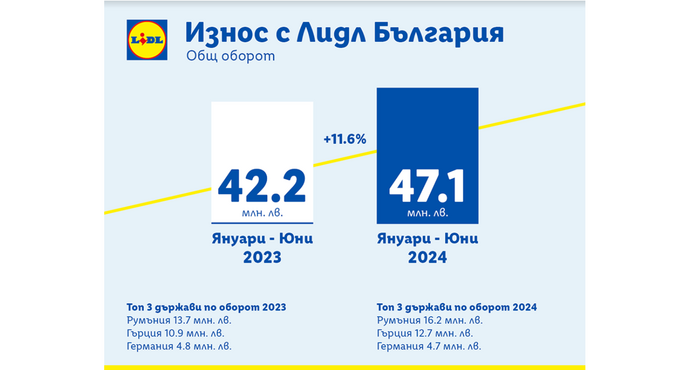 Над 47 млн. лв. е износът, реализиран от български производители в европейската търговска мрежа на Lidl за периода януари-юни 2024 г. Експортният оборот бележи ръст от 11,6% спрямо същия период на миналата година.