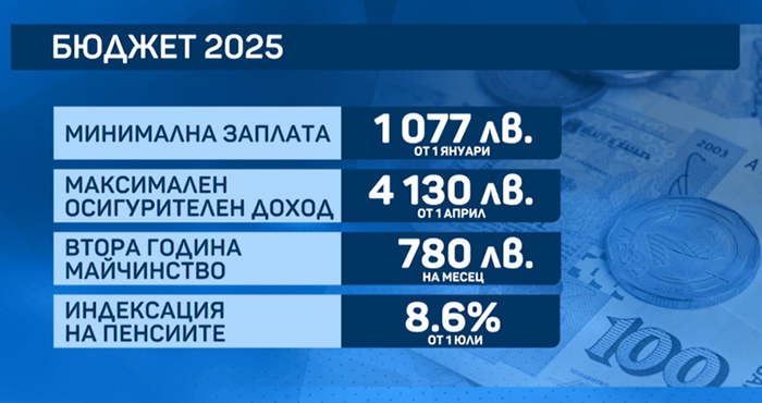 Увеличението на пенсиите по "швейцарското правило" ще е с 8,6 на сто. Минималната заплата ще е 1077 лева, а максималният осигурителен праг достига 4130 лева. Майчинството през втората година остава 780 лева.
