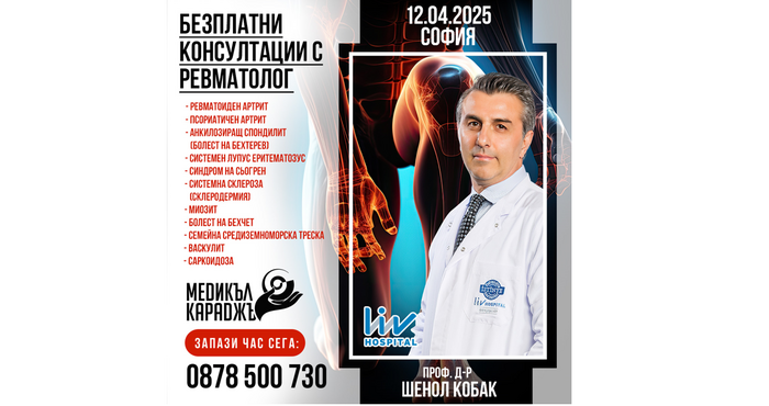 Здравен информационен център „Медикъл Караджъ“ организира безплатни индивидуални консултации с проф. д-р Шенол Кобак – авторитетен ревматолог от болница Лив Улус в Истанбул. Консултациите ще се проведат на 12 април 2025 г. (събота) в град София.