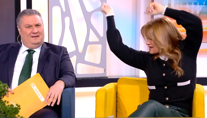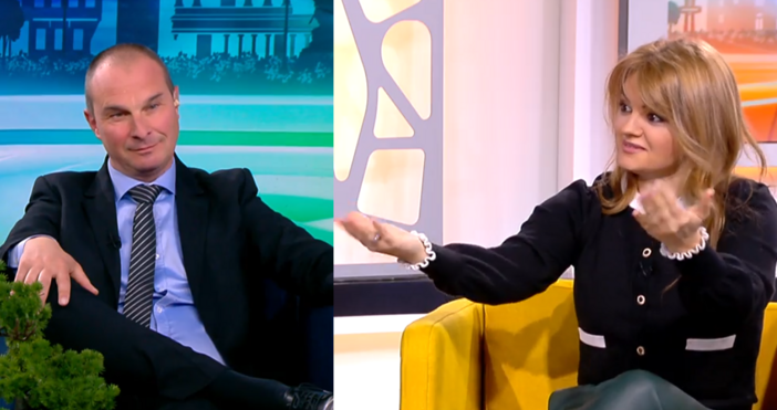 Светската репортерка на телевизията явно беше доста разбудена малко след 6 сутринта, защото не спря да се кълчи на стола си под скептичните погледи на Йочев, Боли Лазаров и Пепи Бакърджиев.
