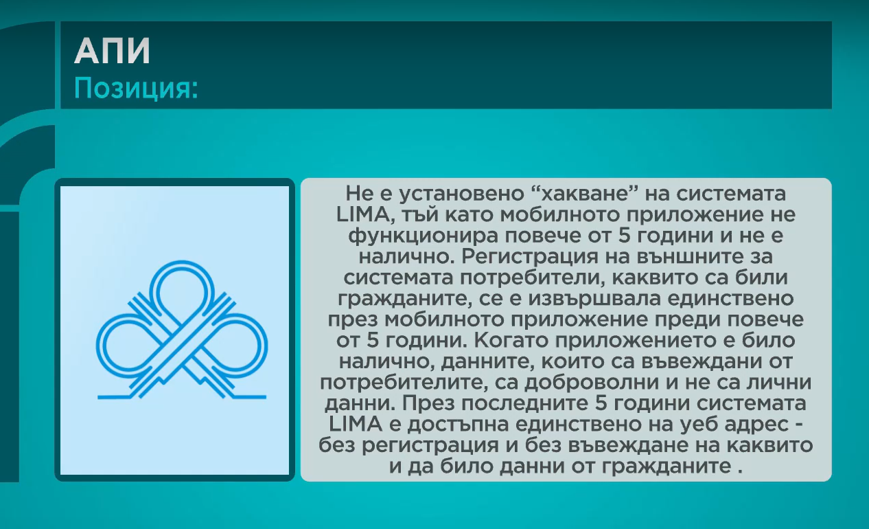 В позиция от Пътната агенция заявиха, че не е установено хакване на системата LIMA, тъй като мобилното приложение не функционира повече от 5 години и вече не е налично. Когато то е било налично, данните, които са въвеждани, са били доброволни и не са лични, твърдят още АПИ. Системата LIMA днес е достъпна единствено през браузър, без регистрация или въвеждане на каквито и да било данни.