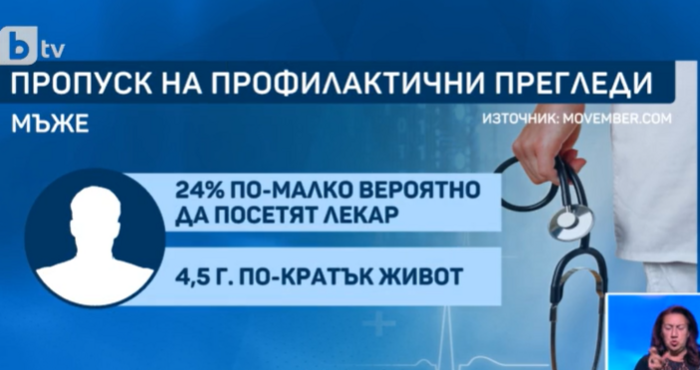С 24 на сто по-малко вероятно е представителите на силния пол да са посетили лекар през последната година, отколкото жените, съобщава bTV.