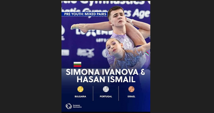 Талантливите Симона Иванова и Хасан Исмаил станаха европейски шампиони при смесените двойки във възраст 11-16 години, предава Нова тв. С изключителния резултат от 27.500 тандемът направи разлика от цели 6 десети от най-близките си конкуренти - Ноа Родригес и Лоренцо Карташо (Португалия), които останаха със сребърните медали. Карен Руински и Шалев Хавшуш (Израел) заслужиха бронза с 26.600. Личен треньор на Симона Иванова и Хасан Исмаил е Гергана Денева. Състезанието беше дебют за българската смесена двойка. Повече от запомнящ се - с европейска титла.