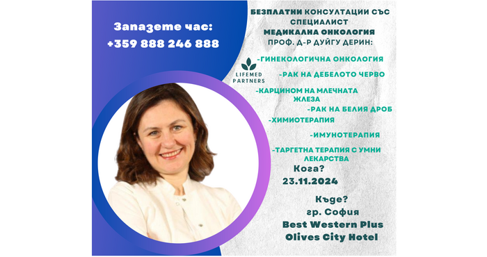 На 23 ноември 2024 г. в София ще гостува професор д-р Дуйгу Дерин, която е една от най-добрите турски онколози, с над 25-годишна практика в сферата на медицинската онкология. Събитието се организира от Здравен инфомационен център Лайфмед Партнърс и предоставя уникална възможност на българските пациенти да получат безплатни консултации от един от водещите експерти в своята област.