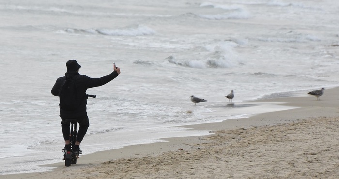 В сивия ноемврийски ден във Варна мъж реши да покара тротинетка край вълните на плажа.