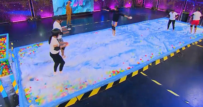 Пързалката е насапунисана, но отборите трябва да пренесат боси по нея топчета, носейки ги внимателно с хилки за тенис на маса. Ако случайно топчето падне, то играчът се връща в изходна позиция.