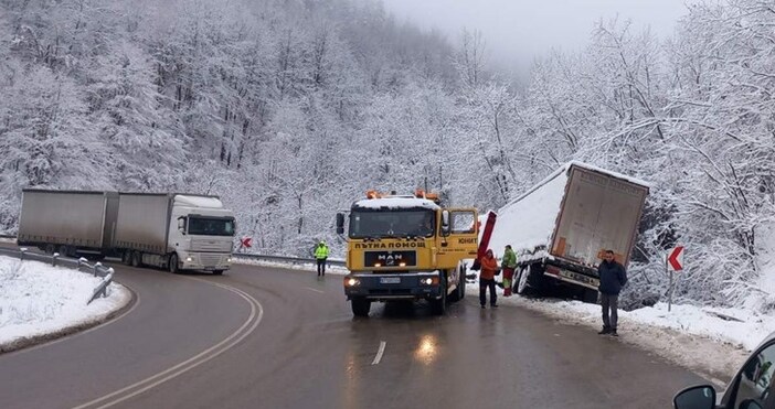 "ТИР аварира в Хаинбоаз. Наложи се да бъде изтеглен със специализирана техника. Товарният автомобил е извън пътното платно и не затруднява движението на автомобили през Прохода на Републиката", заяви тя, визирайки предприетите действия по изтегляне на машината.