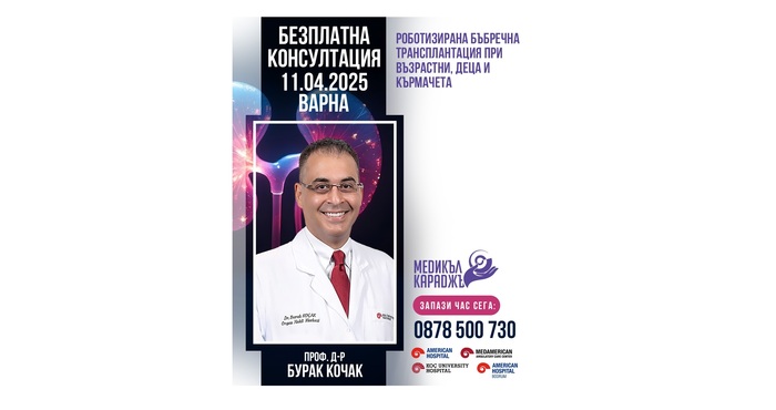 На 11 април 2025 г. във Варна ще се проведе ден за безплатни индивидуални консултации с проф. д-р Бурак Кочак – специалист с дългогодишна практика в областта на бъбречната трансплантация и минимално инвазивната урологична хирургия. Посещението се осъществява по инициатива на Здравен информационен център „Медикъл Караджъ“.