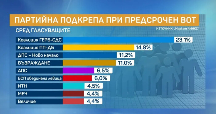 ГЕРБ е първа политическа сила с 23.1% подкрепа, "Продължаваме промяната - Демократична България" печелят вота на 14.8% от хората. Партията на Делян Пеевски "ДПС - Ново начало" е трета политическа сила. За нея биха гласували 11.2% от решилите, че със сигурност ще отидат до урните.