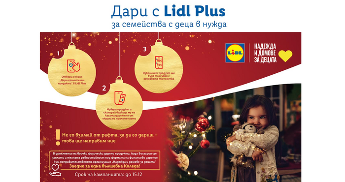 От 2 до 15 декември Lidl стартира национална дарителска коледна кампания в подкрепа на семействата с деца в нужда. В рамките на този период всички потребители на Lidl Plus ще имат възможност да даряват хранителни продукти през приложението. В допълнение Lidl ще предостави и тяхната парична равностойност на организацията партньор в кампанията - „Надежда и домове за децата“. Кампанията стартира знаково в седмицата на Щедрият вторник - световния ден на дарителството, и движение, което вдъхновява хората по целия свят да променят обществата със силата на щедростта и участието си.