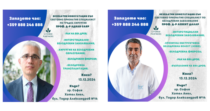 На 13 декември 2024 г. в София ще се проведат безплатни консултации със световно признатите специалисти по белодробни заболявания проф. д-р Аднан Саяр и проф. д-р Левент Далар. За повече информация и записване: 0888246888