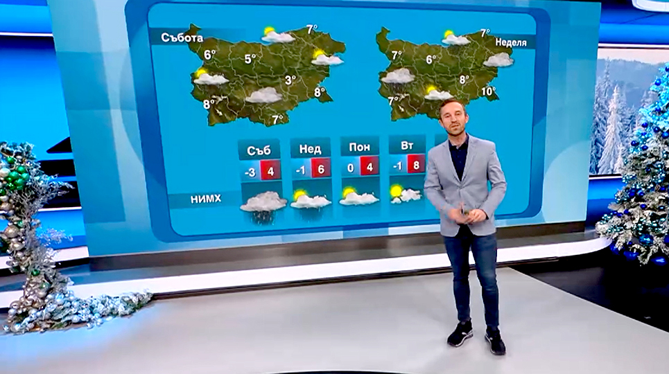 Петък ще бъде един приветлив, слънчев декемврийски ден, с доста ниски температури. Сутрин - под нулата, до към минус 5, минус 6 градуса. Това съобщи в типичния си стил синоптикът на Нова телевизия Николай Василковски.