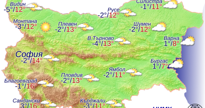 През нощта ще бъде предимно ясно. След полунощ над източните райони отново ще се образува значителна ниска облачност. Ще бъде почти тихо и в сутрешните часове на места в низините и по поречията ще бъде мъгливо. Минималните температури ще бъдат между минус 5° и 0°, в София – около минус 2°. Утре ще бъде предимно слънчево. На места в равнинната част от страната все още ще бъде мъгливо или с ниска слоеста облачност, но до обяд облачността ще намалее, а мъглата ще се разсее и в цялата страна ще се установи предимно слънчево време. Ще бъде тихо или със слаб вятър от изток-североизток. Максималните температури ще бъдат между 10° и 15°, по-ниски по Черноморието, в София – около 14°.