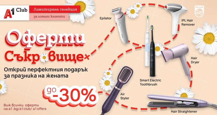 Този март А1 посвещава кампанията „Оферти съкровище“ на всички дами, които ценят иновациите и качествената грижа за себе си. Членовете на А1 клуб могат да се възползват от до 30% отстъпка при покупка в брой от сайта на телекома на селектирани уреди Philips за красота и лична грижа, без необходимост от преподписване на договор или активация на нова услуга. В промоционалната селекция попадат усъвършенствани решения за усмивката, кожата и косата, съчетаващи иновации и удобство в ежедневната грижа. Предложенията дават перфектен избор за всеки, който иска да подари специално внимание на себе си или на важна жена в живота си.
