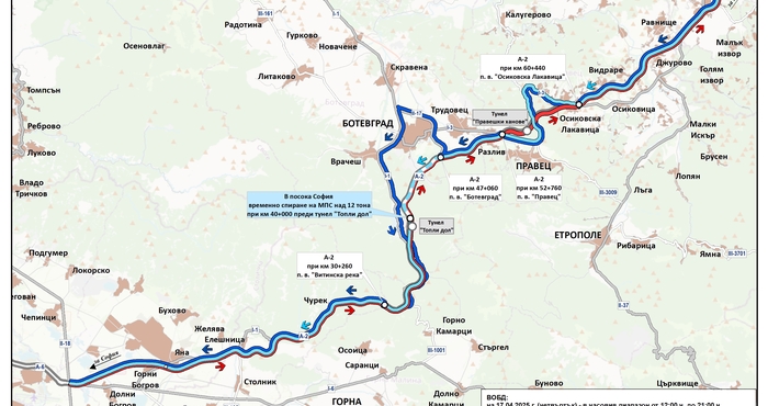 Временно ще бъдат въведени ограничения и обходни маршрути за пътуващите в посока Варна. Трафикът на тежкотоварните камиони над 12 т ще бъде временно ограничен. Превозните средства ще се отклоняват при изхода на София по път I-1 София – Ботевград, при магазин „Джъмбо“, до пътен възел „Яна“, където ще изчакват на място.