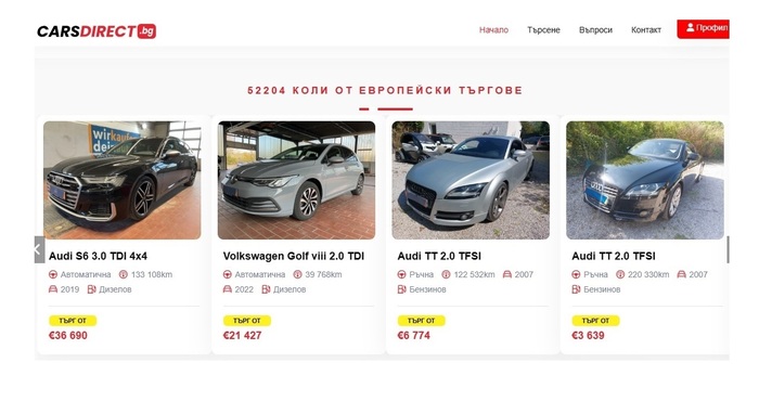 Carsdirect.bg е българска платформа с онлайн каталог, която обединява чуждестранни аукциони и дава възможност за участие в автомобилни търгове в цяла Европа. Екипът предлага консултация относно избора на подходящ автомобил, подбор, закупуване и доставка до посочен адрес от страна на клиента.