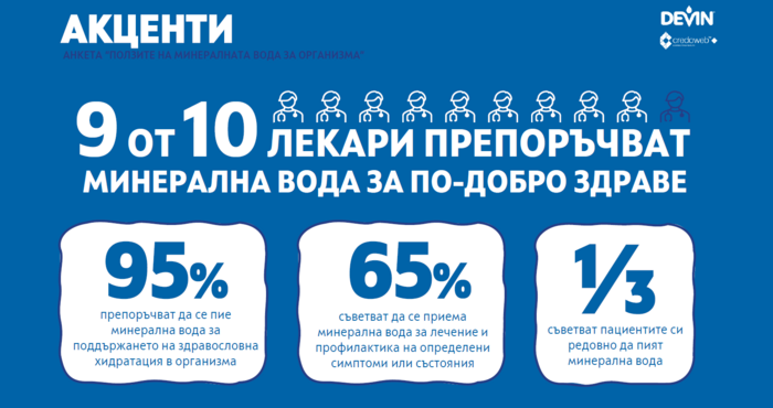 Допитването изследва ролята на минералната вода в ежедневната грижа за здравето и е проведено сред 407 медицински специалисти от общо 26 специалности. Сред тях са ОПЛ и специалисти по нефрология, гастроентерология, вътрешни болести, ендокринология и др. от цялата страна. Част от резултатите бяха публикувани по повод Световния ден на здравето през април, а пълното изследване на лекарските мнения разкрива ключови предимства за редовния прием на минерална вода.