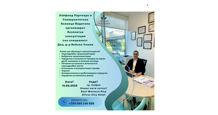 Доц. д-р Вейсел Умман, един от най-изявените специалисти в областта на чернодробните, панкреасните и жлъчните заболявания, ще проведе индивидуални срещи с пациенти в София на 14 юни 2025 г., Посещението му е организирано от информационен център "Лайфмед Партнърс" и цели да даде достъп на български пациенти до експертно мнение за сложни заболявания, свързани с обща и коремна хирургия, черен дроб, панкреас, жлъчни пътища и органна трансплантация -чернодробна и бъбречна.