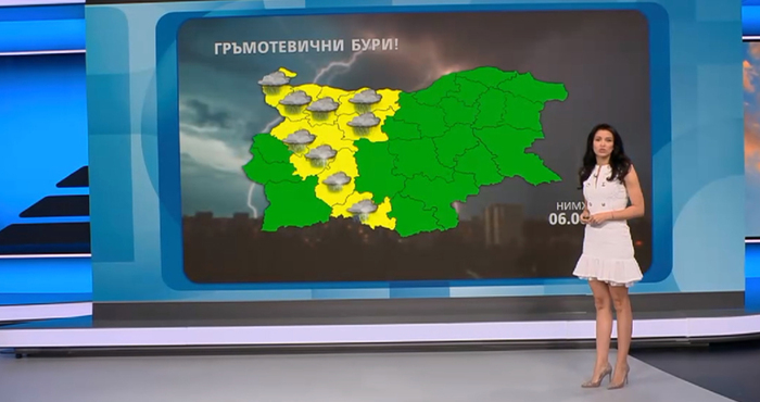 За повечето области на запад е обявен жълт код за проливни дъждове с гръмотевици и опасност от градушки. Бъдете внимателни, особено в следобедните часове, предупреди синоптичката на Нова телевизия Деница Стоянова.