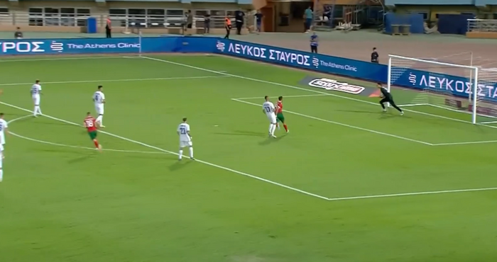 В 37-ата минута Лукас Петков открадна топка при изнасянето от страна на "елините". Българският футболист влезе на скорост в наказателното поле, където беше повален, но главният съдия Нейтън Фербоомен прецени, че няма основание да отсъжда 11-метров наказателен удар в полза на "лъвовете". Първото полувреме завърши с изстрел с глава на Фотис Йоанидис, уловен от Димитър Митов пред българската голлиния.