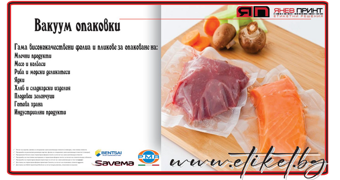 – опаковане на месо и месни продукти (колбаси, шунка, създарма, субпродукти и др.)