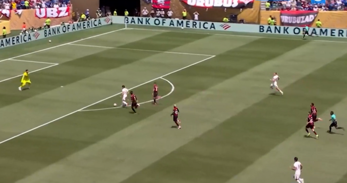 Само минута по-късно бразилците сгрешиха при изпълнението на нарушението, топката бе отнета от Педро Нето, който демонстрира своята скорост, напредна и отбеляза за 0:1.