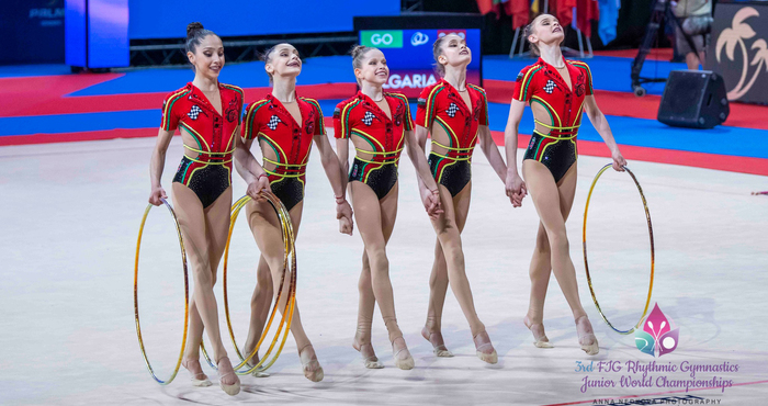Рая Божилова, Йоана Мотева, Анания Димитрова, Габриела Трайкова, Ивайла Велковска и Елена Христова събраха сбор от 49.900 точки, след като получиха 24.500 точки за изпълнението с пет обръча и 25.400 точки за това с пет чифта бухалки, предава БНР.