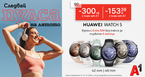 През юли А1 предлага специална кампания, посветена на новата серия смартчасовници Huawei Watch 5 LTE. Устройствата идват с до 300 лв. отстъпка при покупка в брой и на лизинг с план Unlimited, както и с Extra SIM без такса за първите 6 месеца. Създаден за активния начин на живот и моментите извън офиса, моделът е идеалният партньор за лятото – независимо дали сте на път, в града или сред природата.