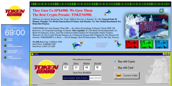 TOKEN6900 (T6900) е нов меме токен без вътрешна стойност или реална полезност - основава се на хумор, ирония, интернет култура и енергията на общността. Въпреки че е в предпродажба само от няколко дни, вече е събрал над $301 хиляди, привличайки онези, които търсят следващия „вайръл“ токен.