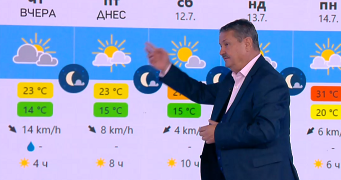 Иначе в София днес няма да е 23, ще бъде повече, защото вече вятърът падна. Няма го вече този хладен вятър, идващ от Централна Европа вятър. 15 градуса, това е в „Младост“, иначе в центъра, аз докато пътувах беше 17 градуса, а през деня ще надхвърли 23. Включваме топлото още от следобед, за събота и неделя в София очакваме 30 градуса, продължи той.