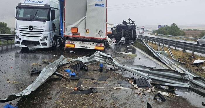 Двата камиона са преобърнати. Движението се осъществява само в едната лента и се регулира от полицията, допълва пътният експерт.