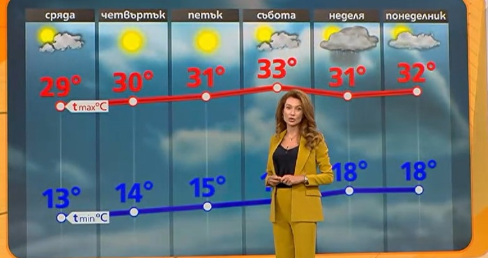 Днес повече облаци ще има в южните части на страната, докато на север денят ще е предимно слънчев. Валежи не се очакват. Следобед в източните райони ще духа умерен източен вятър. Максималните температури ще достигат от 26 до 31 градуса в района на Сандански. Морето продължава да е с добри условия за плаж. Ще е слънчево като едва късно следобед ще се появи разкъсана облачност. Температурата на въздуха ще е до 28 градуса, а морската вода е с градус – два по-хладна. Морето днес ще е спокойно.