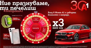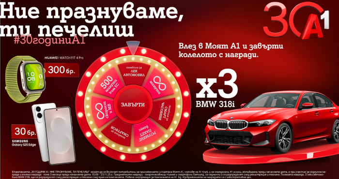 Именно в Моят А1 компанията кани своите клиенти да отпразнуват юбилея със специалното издание на „Колелото на съдбата“ в А1 клуб с 333 предметни награди и нови моментни бонуси. От 15 септември до 23 ноември всеки регистриран потребител на приложението и на уеб портала a1.bg може да завърти Колелото и да спечели – неограничени минути за национални разговори и неограничени мегабайти и скорост, валидни 24 часа от активацията, или роуминг пакет и 500 международни минути към ЕС, които могат да бъдат използвани в рамките на 30 дни. Колелото има три сектора, които дават възможност за участие в тегленето на предметни награди – 300 смартчасовника Huawei Watch FIT 4 Pro и 30 смартфона Samsung Galaxy S25 Edge. А в края на кампанията трима късметлии ще си тръгнат и с големите награди – автомобили BMW 318i.