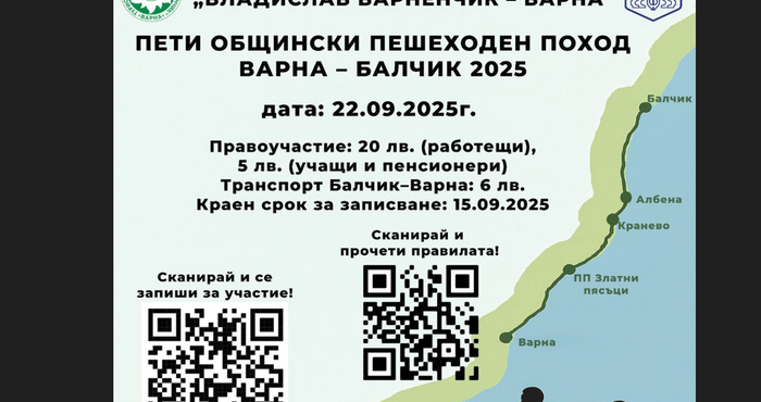 За пета поредна година по повод Денят на независимостта на България – 22 септември, варненското туристическо дружество „Владислав Варненчик”, заедно с Дирекция "Спорт" към Община Варна, организират Черноморски поход Варна-Балчик.