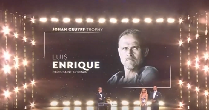 Испанският специалист не присъства на церемонията, защото по същото време ПСЖ играе отложеното дерби на Лига 1 срещу Марсилия. Той обаче записа специално видео, в което благодари за наградата на името на Йохан Кройф.