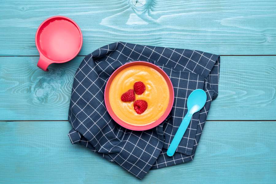 В началото на захранването предлагайте храна с гладка консистенция. Основното хранене остава кърмата или адаптираното мляко. Препоръката е да се започне с пюрета от зеленчуци – тиква, морков, картоф, а нова храна да се въвежда през интервал от 3–5 дни. Постепенно може да се включват безглутенови каши и плодови пюрета.