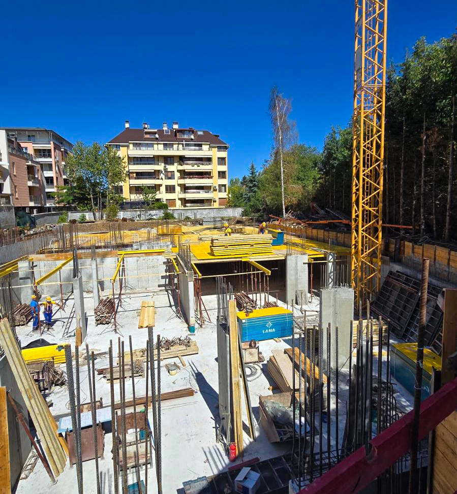 Строителството напредва с впечатляваща скорост – фундаментът е вече завършен, изграждат се вертикалните елементи на ниво -1, а кофражът на партерната плоча е в процес на изпълнение.