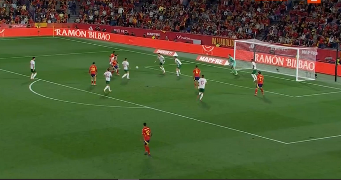 В 30-ата минута Педри потърси мрежата от воле, но топката премина покрай българската врата. В 34-ата минута Микел Оярсабал шутира от границата на наказателното поле, но Вуцов отново изби. Скоро след това крепостта падна. Микел Мерино посрещна топката с глава след центриране отдясно и направи това, което стори в Щутгарт срещу Германия на Евро 2024 - гол за Испания.