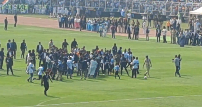 Видео от ANI показва фенове, които хвърлят счупени седалки на стадиона и други предмети по терена и лекоатлетическата писта на мястото, като няколко души, които са прескочили оградата около игрището, са хвърляли предмети.