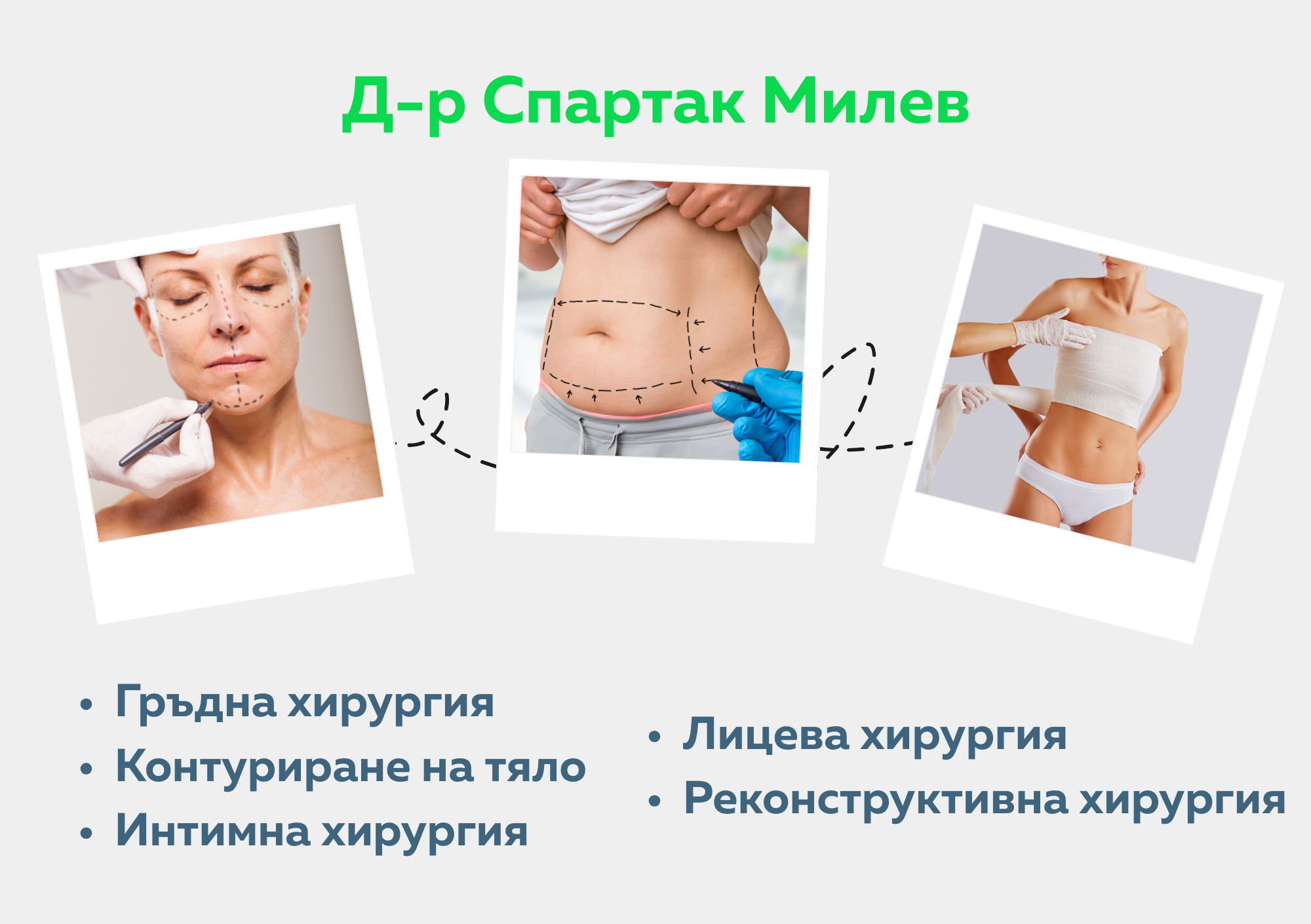 Д-р Милев извършва редица процедури в областта на пластичната, реконструктивната и естетичната хирургия, сред които: