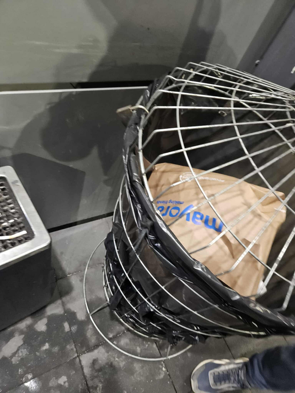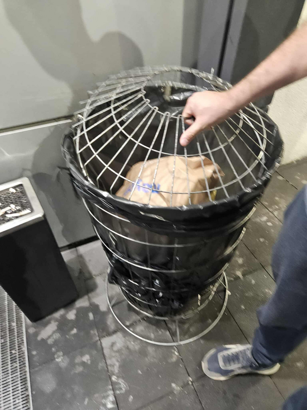 До изхода на супермаркета има кош за боклук, който е покрит с метална скара.