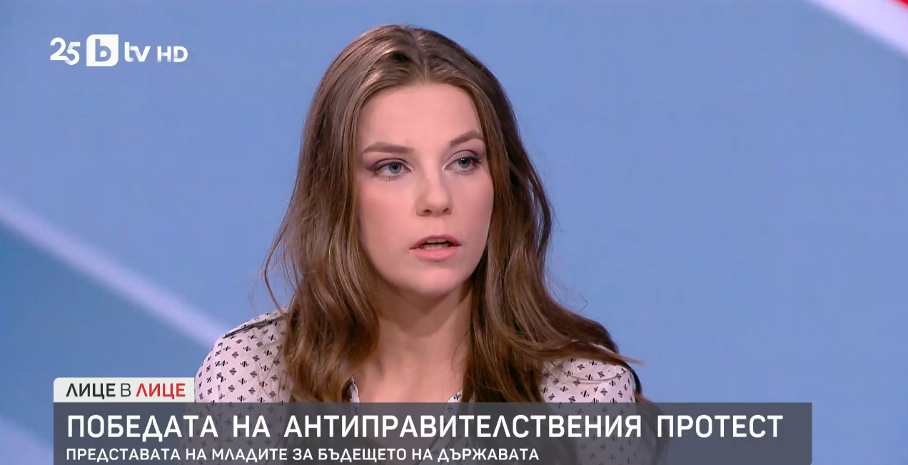 Три млади дами, които участваха в последните протести, гостуваха в "Лице в лице". Пред Цветанка Ризова застанаха социологът Ана Будакова, студентът Елена Тодорова и Лекси Фльор, която е живяла във Франция и Швейцария, и след като е завършила магистратура в Ню Йорк, се занимава с изкуство.