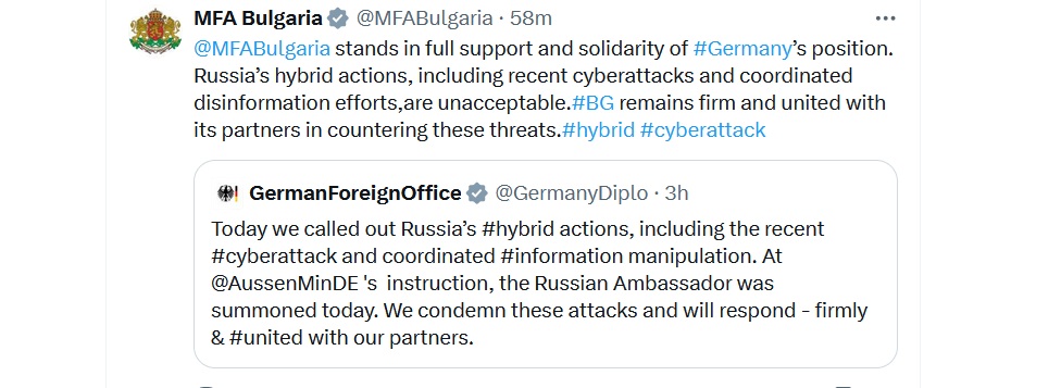 Министерството на външните работи (МВнР) изразява пълната си подкрепа и солидарност с позицията на Германия, която обвини Русия в изборна намеса и кибератака срещу въздушния трафик. Това посочиха от министерството в публикация в платформата Екс, предаде БТА.