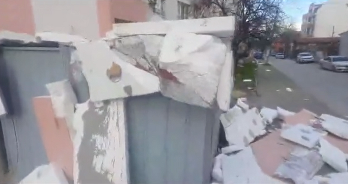 Стена с изолация се стовари върху гаражи и пътека до жилищен блок в Асеновград. На първия етаж падналата мазилка е изкъртила два климатика.