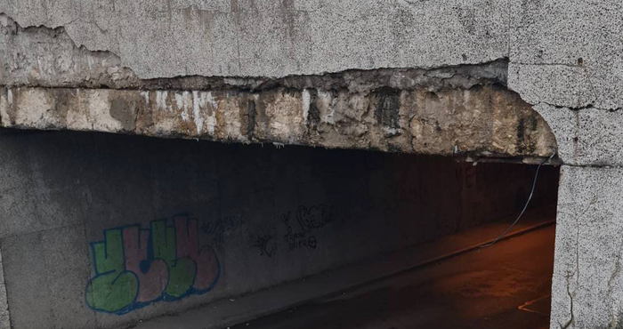 Съоръжението, което се състои от пешеходна и автомобилна част, е видимо разрушено - по тавана и стените се забелязват напукана и разпадаща се мазилка, висящи кабели и счупени елементи.